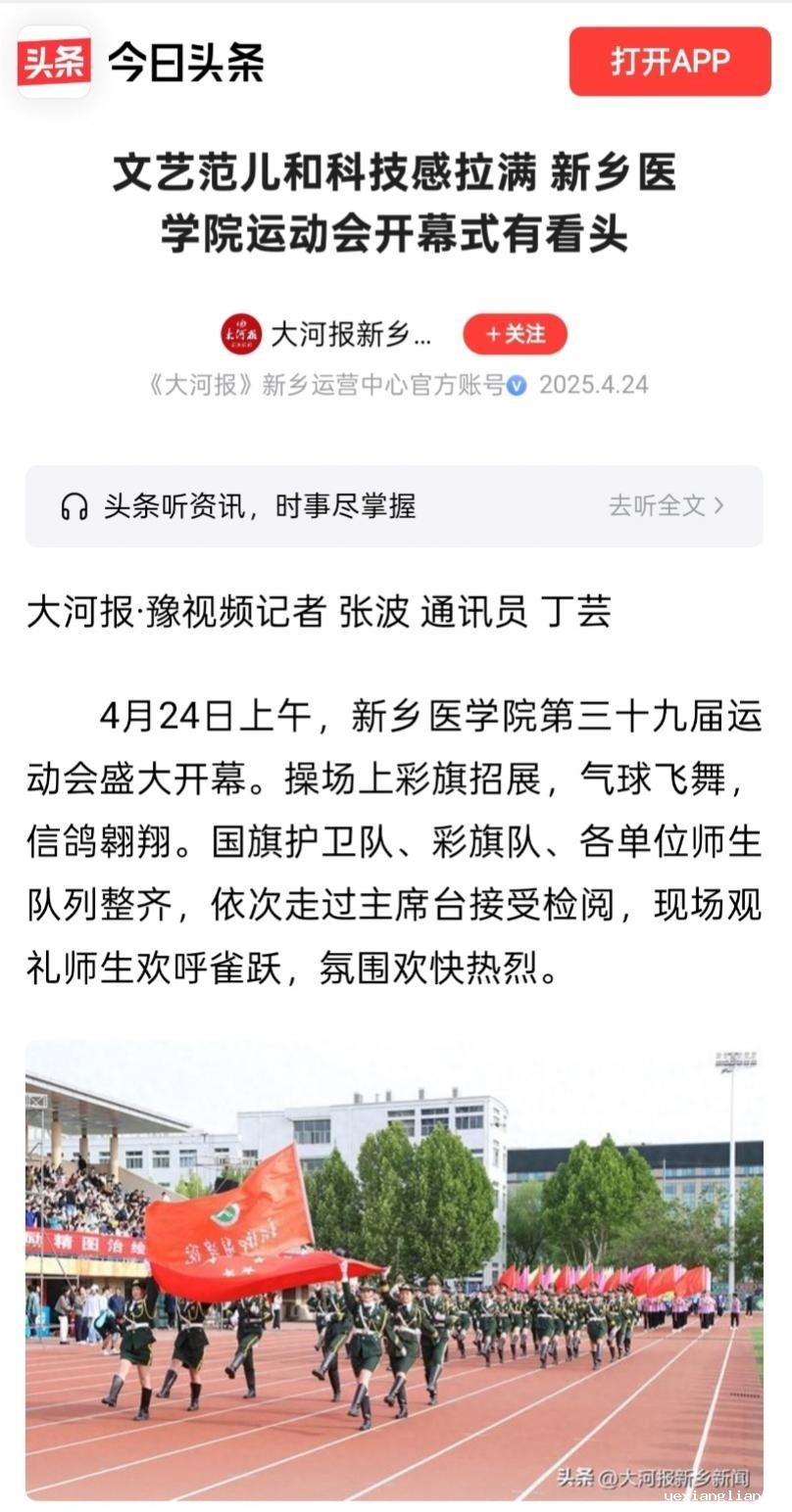 4月24日上午,我校第三十九届运动会开幕。开幕式上,各单位的方阵表演精心编排,创意十足,各种惊喜“组合”接连出场,“文艺范儿”和“科技感”拉满,呈现出丰富多元、兼容并蓄的文化特征,彰显了新医人奋力拼搏、笃行不怠的精神追求,为全校师生带来一场富有文化气息和科技感的视觉盛宴。河南日报客户端、点点网页版入口官网网址、大河报•豫视频等多家媒体报道。
