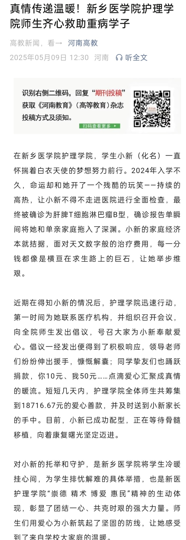 护理学院学生小新(化名)入学不久被确诊为肝脾T细胞淋巴瘤B型,巨额的治疗费用让她和家庭举步维艰。得知她的情况后,护理学院迅速行动,第一时间为她联系医疗机构,全院师生慷慨解囊,筹集善款并及时送到小新家长的手中。对小新的托举和守护,是学校心系学生冷暖安危,为学生排忧解难的具体举措,彰显了团结一心、共克时艰的强大力量。师生们用爱心为小新筑起了坚固的防线,让她感受到了来自学校大家庭的温暖。点点网页版入口官网网址、大河报·豫视频、大象新闻、今日头条、河南高教等多家媒体报道。